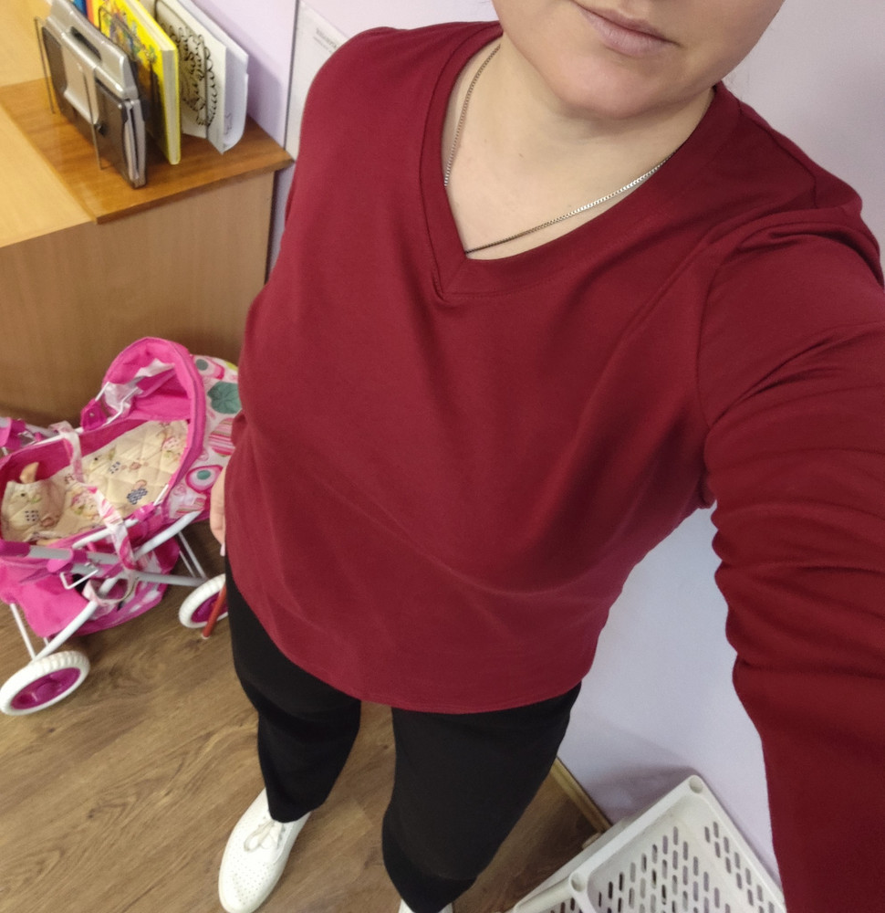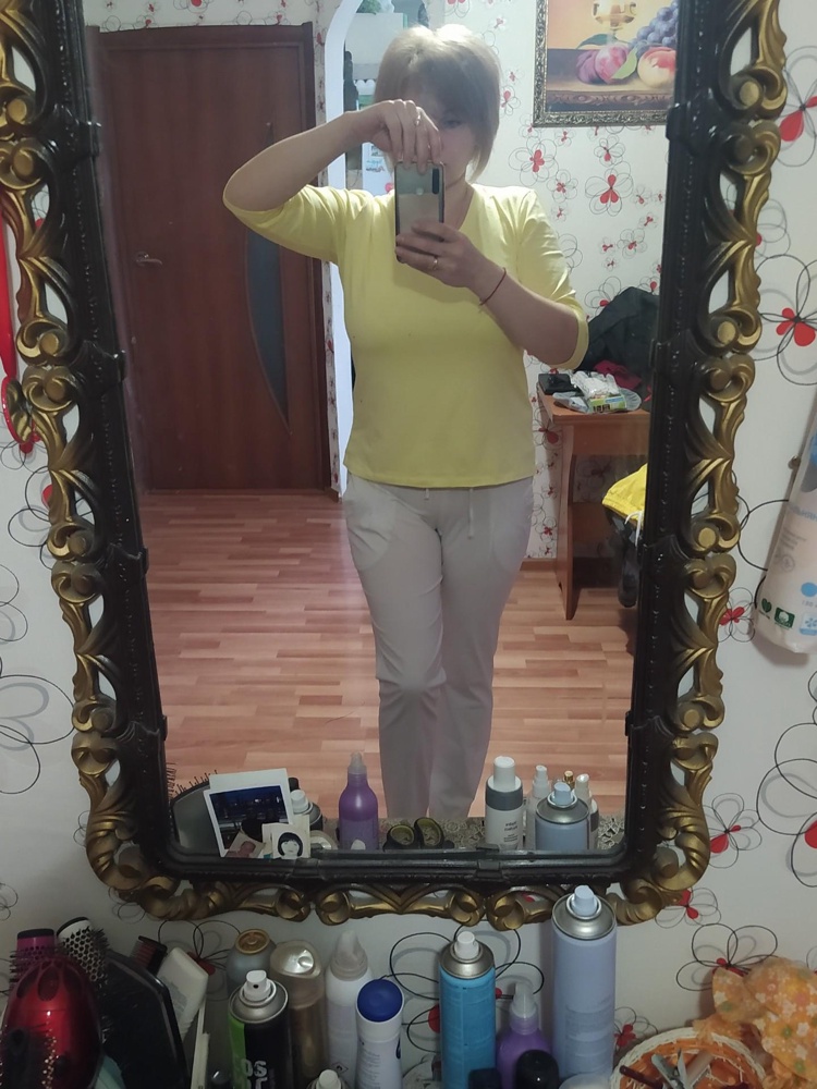 Боялась, что будет в обтяжку и взяла побольше, но напрасно. На 52р. велика. Качество хорошее, ткань довольно плотная. В этом цвете выглядит простовато. Отказ.